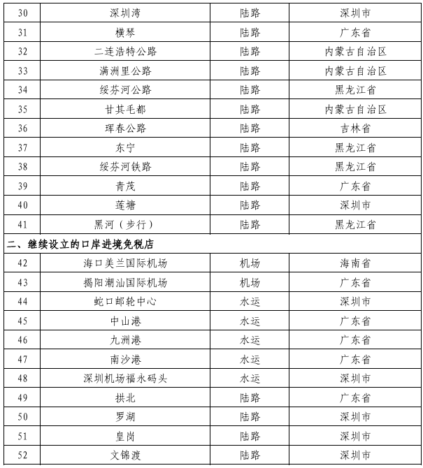 二、继续在海口美兰国际机场、蛇口邮轮中心等11个口岸设立口岸进境免税店(在本通知所附《设立口岸进境免税店名单》中为序号42—52)。