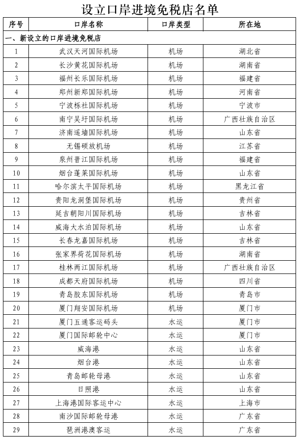 一、在武汉天河国际机场等41个口岸各新设1家口岸进境免税店(在本通知所附《设立口岸进境免税店名单》中为序号1—41)。其中,横琴口岸进境免税店设立后,允许自澳门进境居民旅客在该口岸进境免税店购买一定数量(15000元以内)的免税商品。