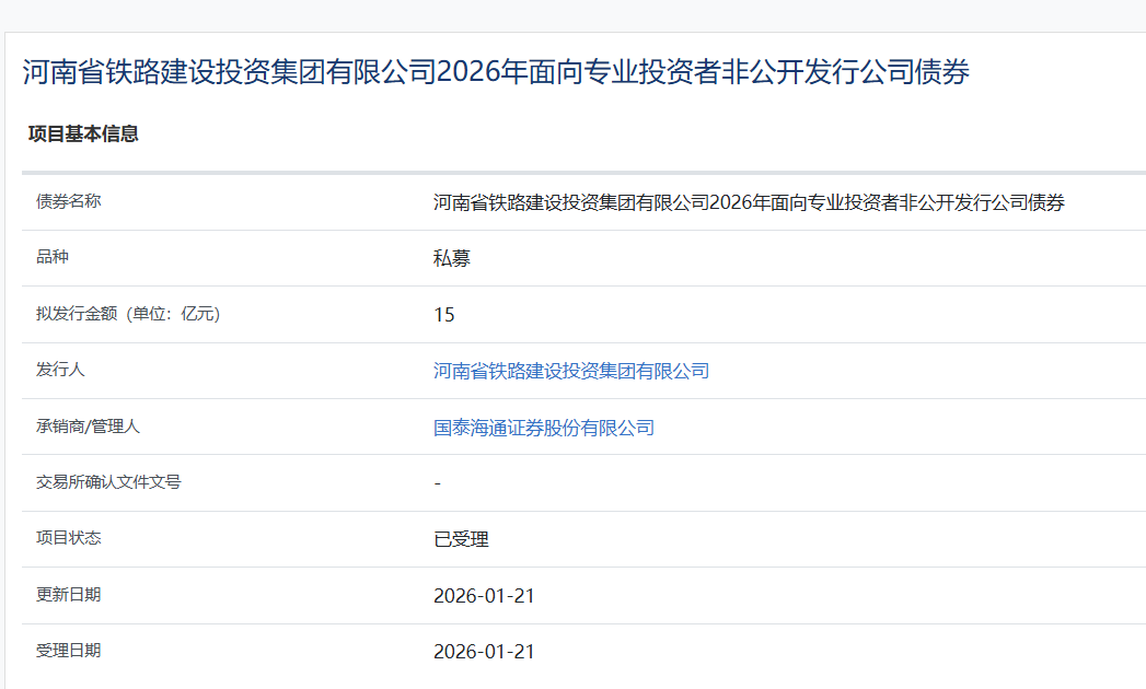 【大河财立方消息】1月21日,河南省铁路建设投资集团有限公司2026年面向专业投资者非公开发行公司债券项目,获上交所受理。