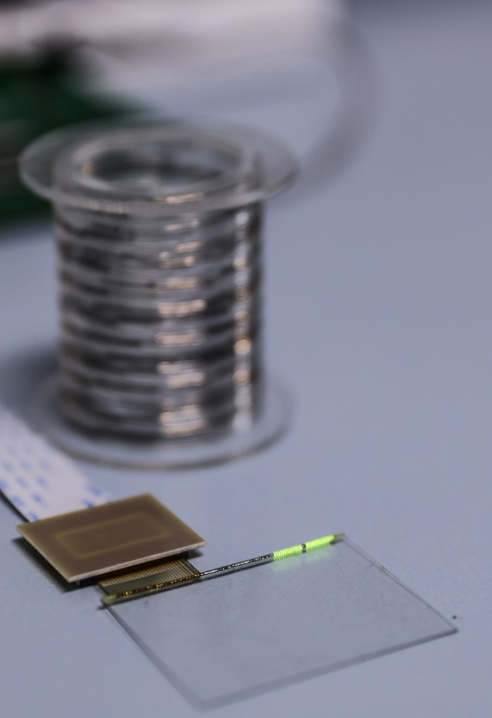 成卷的纤维芯片和装有纤维芯片的器件图(袁婧摄)