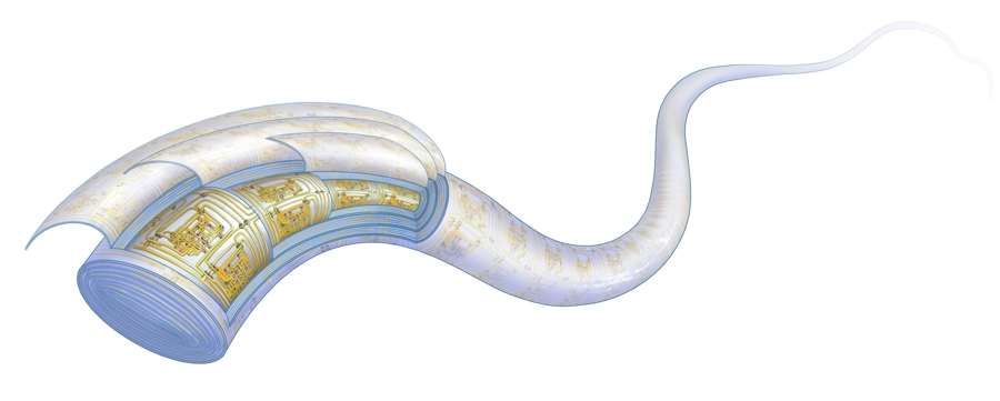 此次,团队终于通过在柔软、弹性的高分子纤维内建立多层旋叠架构设计思想,实现微型电子器件高集成密度,有望摆脱对硅基芯片电路的依赖。