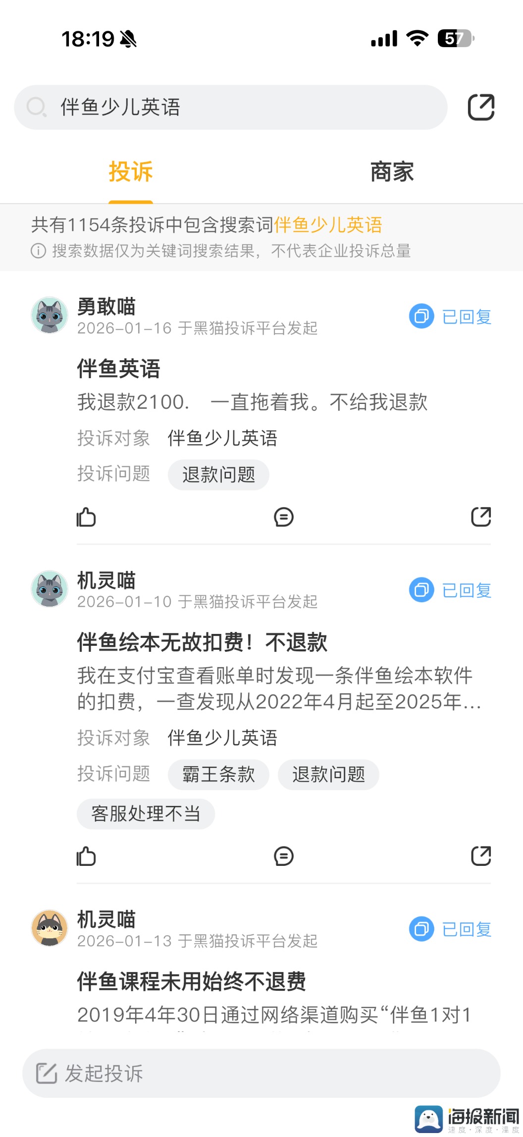 黑猫投诉平台显示,关于伴鱼少儿英语的投诉共有1154条。