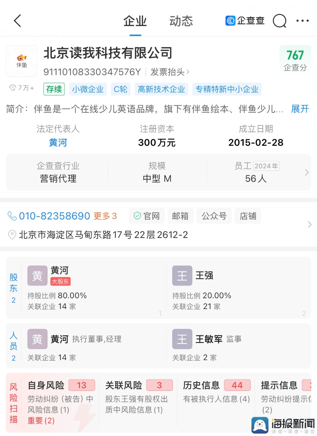 于女士提供的付款信息显示,收款方为北京读我科技有限公司。记者在企查查看到,伴鱼少儿英语所属公司确为北京读我科技有限公司,注册资本300万元,实缴资本300万元,法定代表人黄河持股80%。