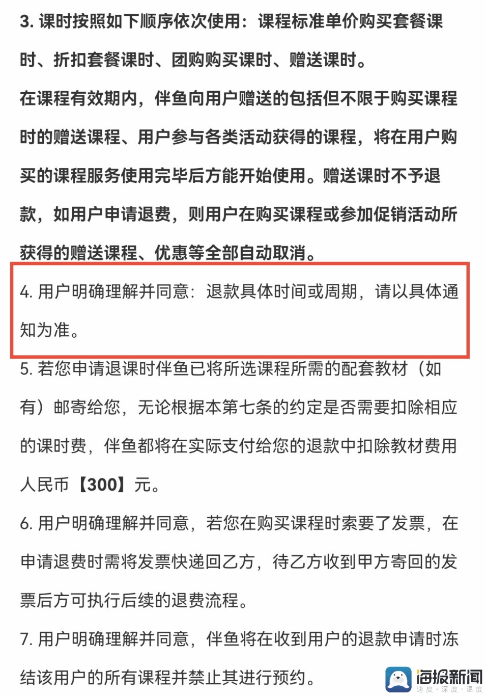 记者在于女士提供的购课合同中看到,合同中明确标有退费的相关流程,但关于退费周期,其显示“用户明确理解并同意:退款具体时间或周期,请以具体通知为准。”