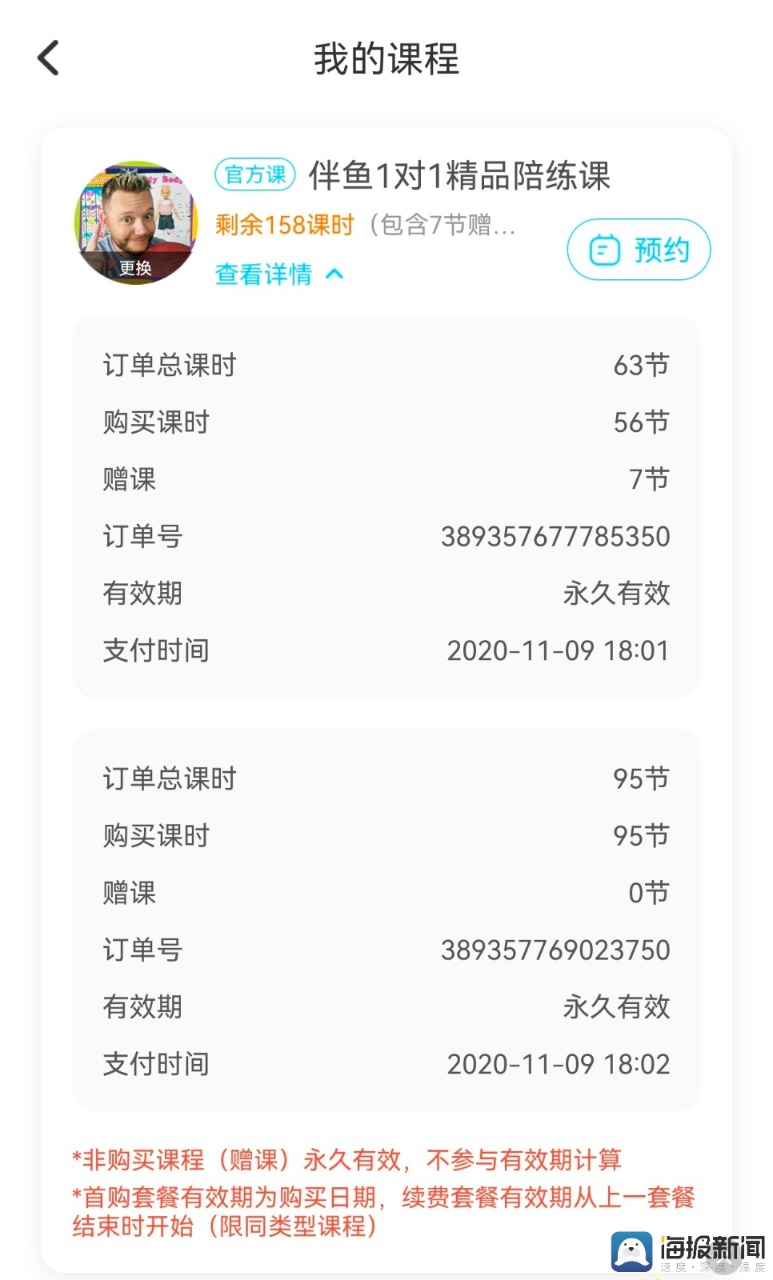 据于女士介绍,2020年11月,她为孩子续购了伴鱼少儿英语的两期外教一对一课程,单期价格9280元,续费共花费18,560元,她已累计购买4期课程。“孩子上高中后学习压力大,假期还要完成学校作业,根本没时间上课。”于女士表示,伴鱼少儿英语的课程针对6岁至12岁儿童,侧重分级绘本阅读,孩子升入高中后,不仅时间紧张,新购买的课程内容也已不再适配,故自2022年起停止上课,其中一期课程仅上了几节,另一期则完全未开课。