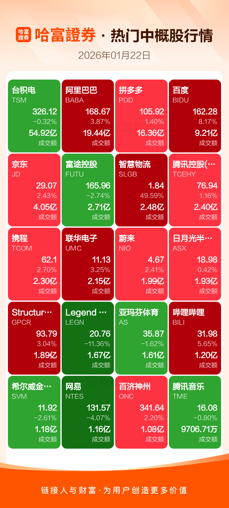 台积电跌0.32%,阿里巴巴涨3.87%,拼多多涨1.40%,百度涨8.17%,京东涨2.43%,富途控股跌2.74%,智慧物流涨49.59%,腾讯控股(ADR)涨1.16%,携程涨2.70%,联华电子涨3.25%。
