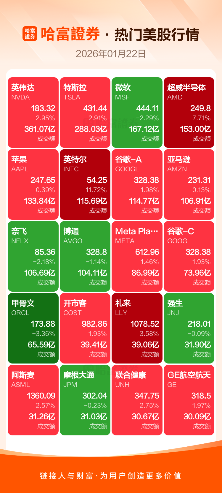英伟达涨2.95%,特斯拉涨2.91%,微软跌2.29%,超威半导体涨7.71%,苹果涨0.39%,英特尔涨11.72%,谷歌-A涨1.98%,亚马逊涨0.13%,奈飞跌2.18%,博通跌1.14%。
