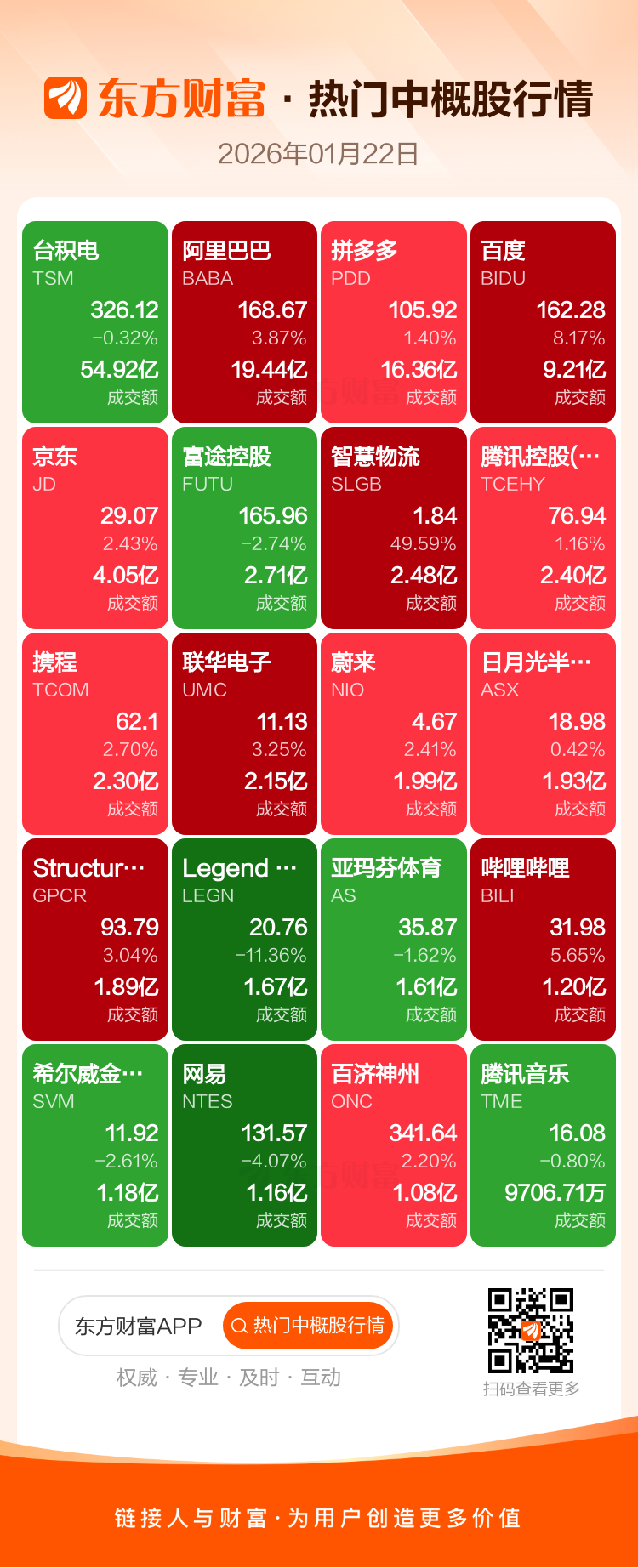 台积电跌0.32%,阿里巴巴涨3.87%,拼多多涨1.40%,百度涨8.17%,京东涨2.43%,富途控股跌2.74%,智慧物流涨49.59%,腾讯控股(ADR)涨1.16%,携程涨2.70%,联华电子涨3.25%。