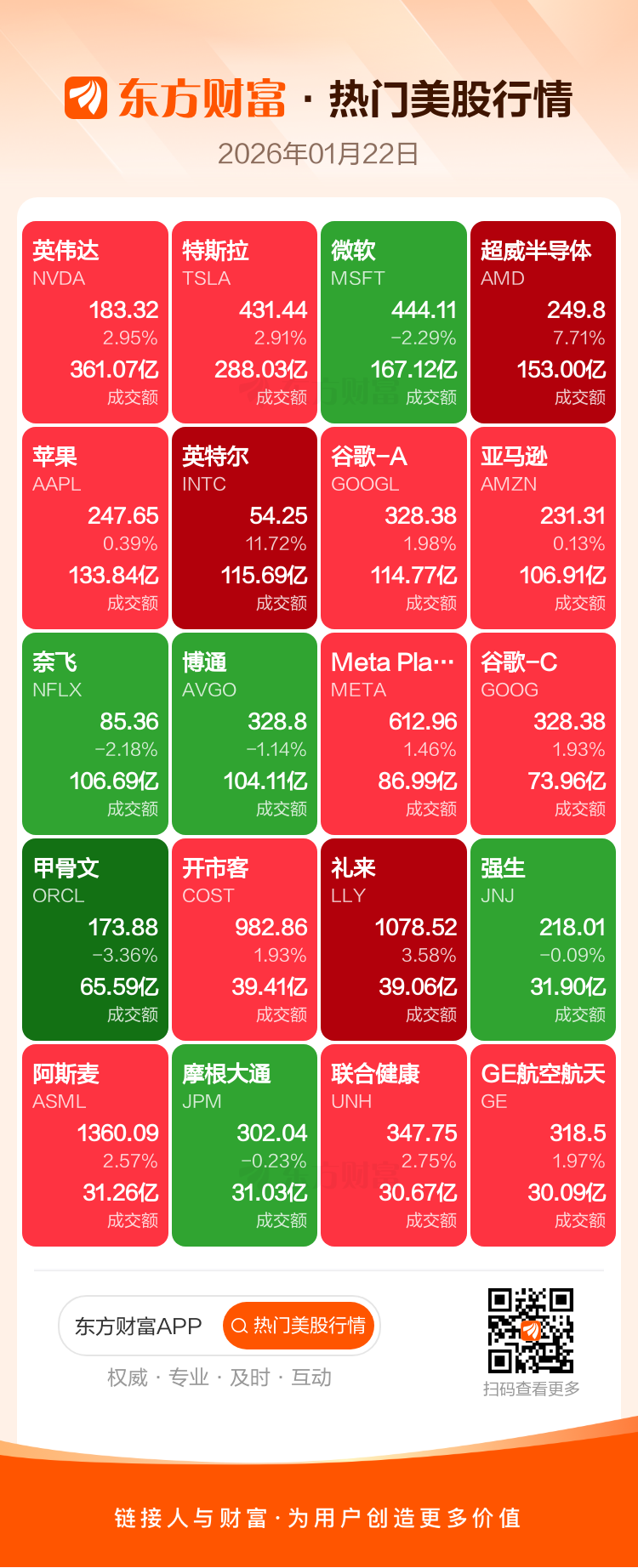 英伟达涨2.95%,特斯拉涨2.91%,微软跌2.29%,超威半导体涨7.71%,苹果涨0.39%,英特尔涨11.72%,谷歌-A涨1.98%,亚马逊涨0.13%,奈飞跌2.18%,博通跌1.14%。