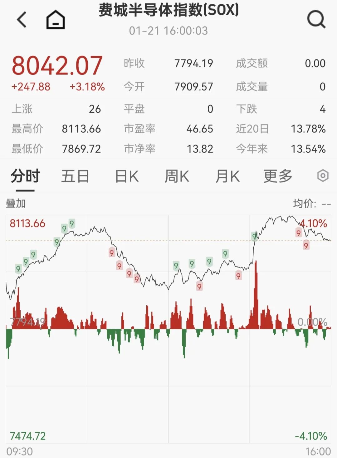 黄仁勋对AI的乐观展望推动芯片股普遍上涨。费城半导体指数涨3.18%,刷新历史新高。
