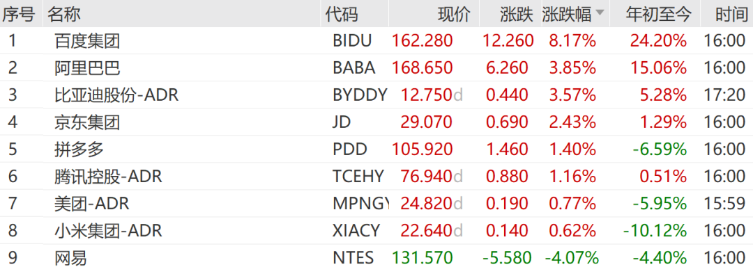 百度集团涨8.17%,阿里巴巴涨3.85%,比亚迪股份涨3.57%,领涨万得中概科技龙头指数成份股。