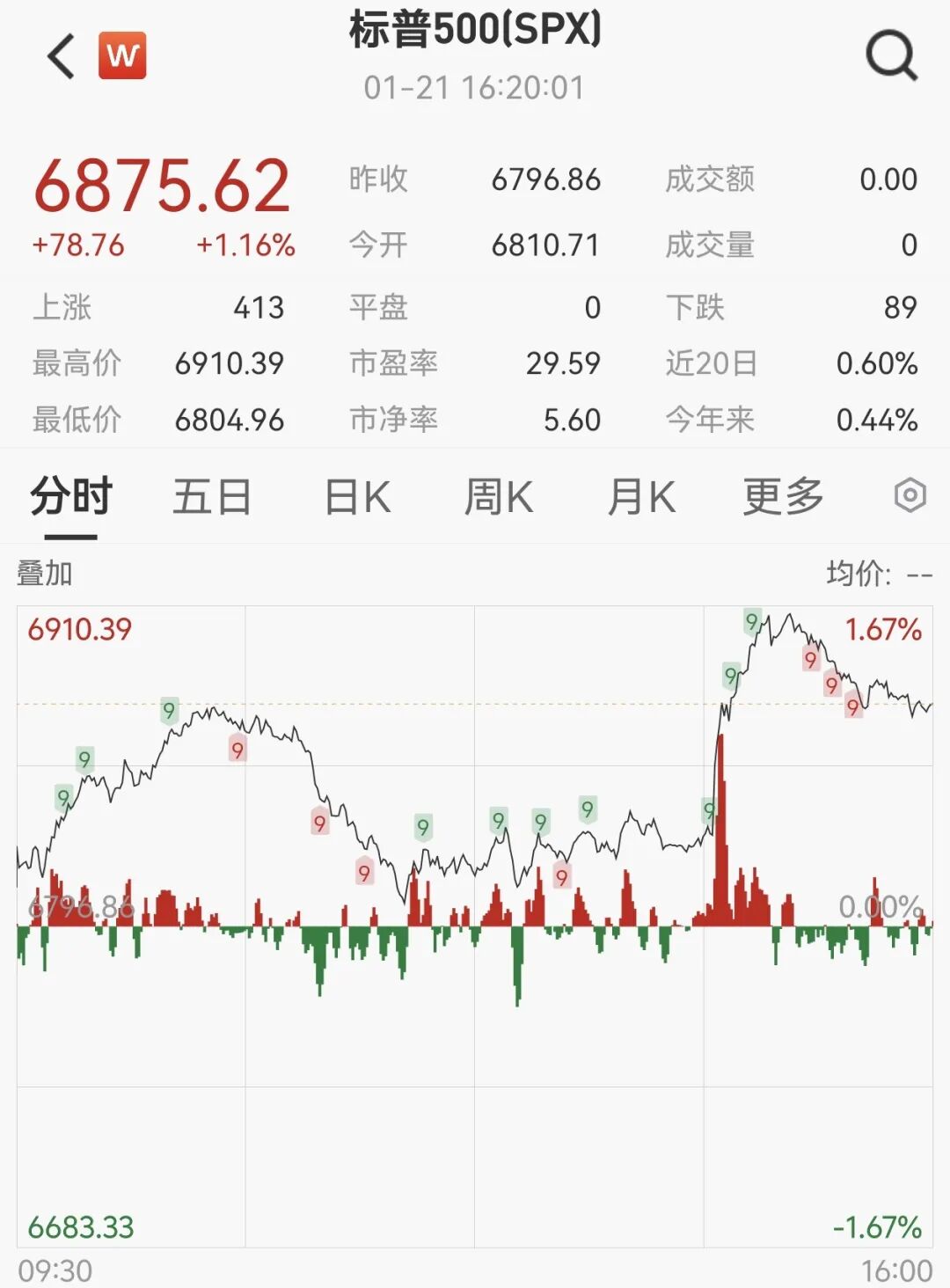 美国三大股指全线收涨,中国资产大幅上涨,大型科技股多数上涨。在达沃斯论坛上,特朗普明确表示,不会武力夺取格陵兰岛;黄仁勋称AI是“人类历史最大规模基建”的基石,刺激芯片股普遍上涨。