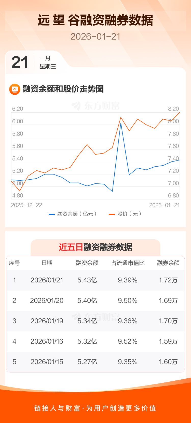 交易所最新数据显示,远 望 谷于2026年1月21日获融资买入4110.91万元,融资偿还3837.01万元,当日融资净买入273.89万元。目前,该股融资余额5.43亿,占流通市值比例为9.39%。