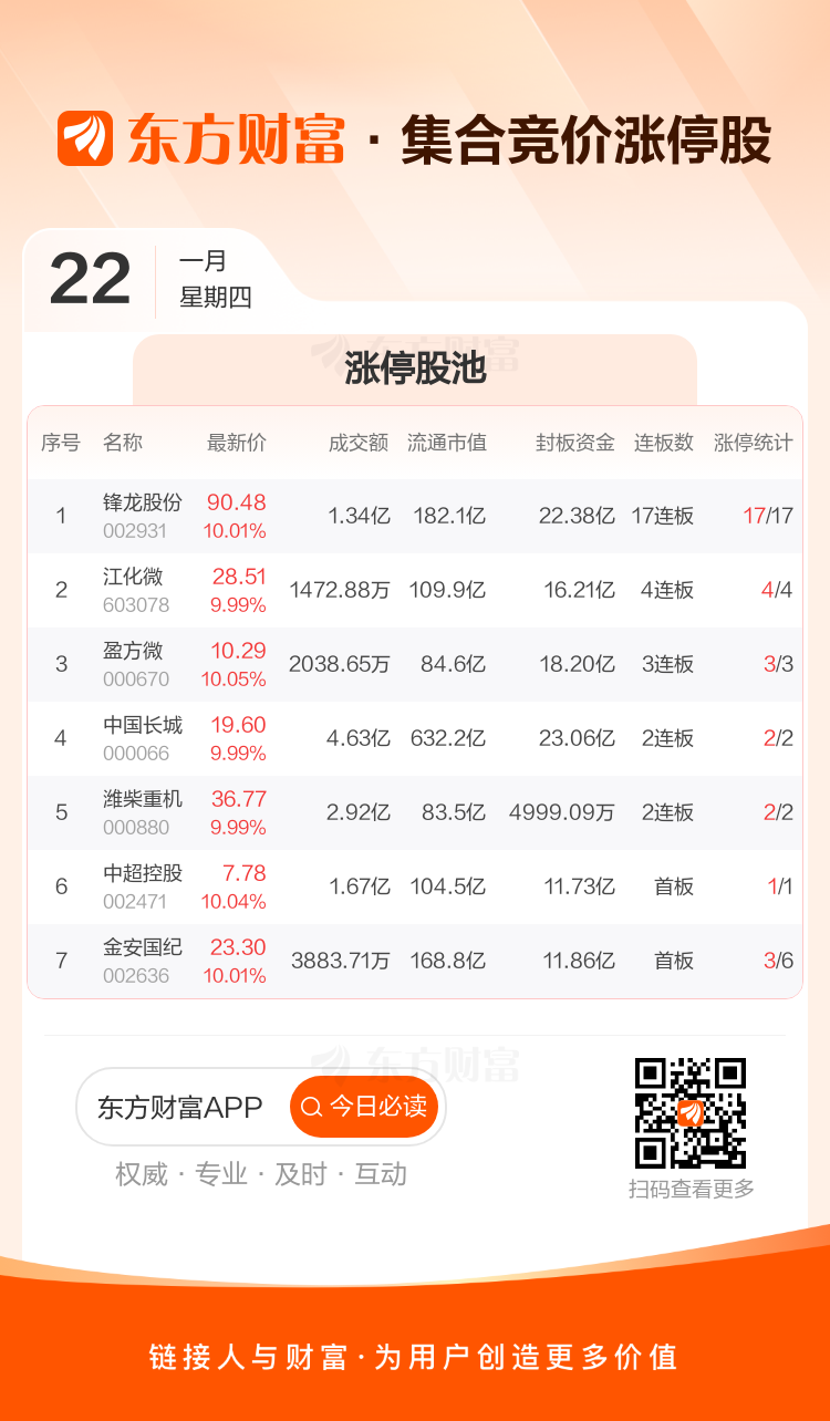 1月22日集合竞价:锋龙股份17连板 江化微4连板