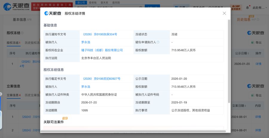 天眼查天眼风险信息显示,近日,罗永浩新增一则股权冻结信息,股权所在企业为锤子科技(成都)股份有限公司,冻结股权数额713万余元,冻结期限自2026年1月20日至2029年1月19日,执行法院为北京市丰台区人民法院。