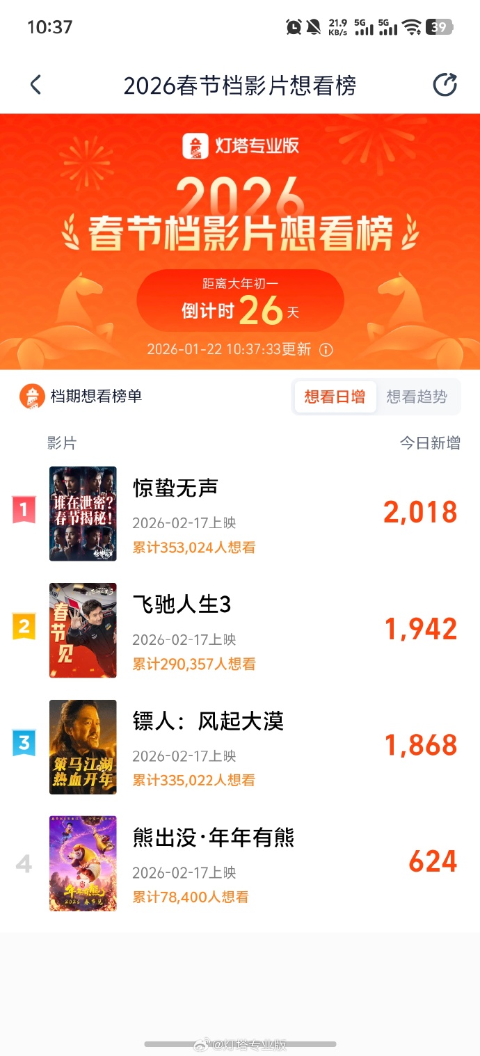 1月22日,据灯塔专业版,《惊蛰无声》今日定档,截至当前已有4部影片官宣定档2026春节档,其余三部分别为《飞驰人生3》《镖人》《熊出没·年年有熊》。