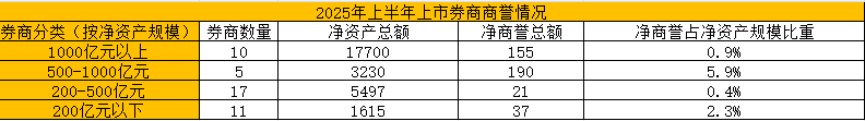 另据中证协最新一期《传导》中的数据,截至2025年上半年,43家上市券商商誉合计达403亿元,占净资产1.4%;从资产结构分析,中型券商(净资产500-1000亿元)商誉占净资产比例5.9%,超过行业均值和大型券商。