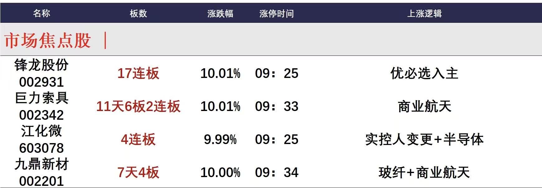 今日午盘全市场共45股涨停,连板股总数10只,25股封板未遂,封板率为64%(不含ST股、退市股)。焦点股方面,实控人变更的锋龙股份17连板、江化微4连板,商业航天概念股巨力索具11天6板、九鼎新材7天4板。