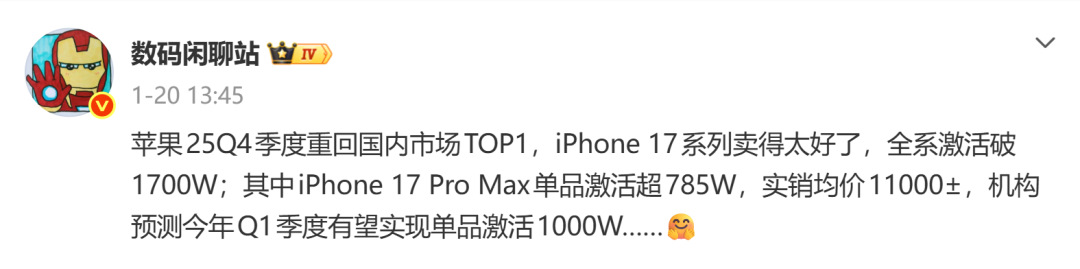 博主表示,机构预测iPhone 17 Pro Max在2026年第一季度激活量有望达到1000万台。