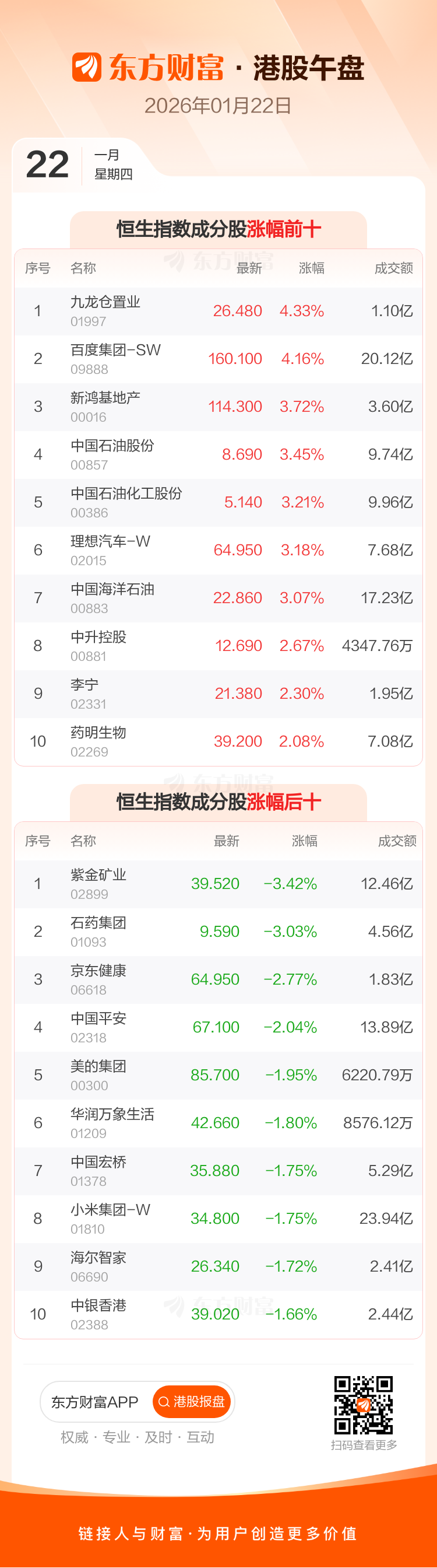 港股1月22日午盘走低,恒生指数收报26558.28点,跌26.78点,跌幅0.1%;恒生科技指数收报5722.87点,跌23.43点,跌幅0.41%。恒生指数成分股中九龙仓置业、百度集团-SW、新鸿基地产涨幅居前,紫金矿业、石药集团、京东健康跌幅靠前。恒生科技指数成分股中百度集团-SW、金蝶国际、理想汽车-W涨幅居前,京东健康、小鹏汽车-W、地平线机器人-W跌幅靠前。