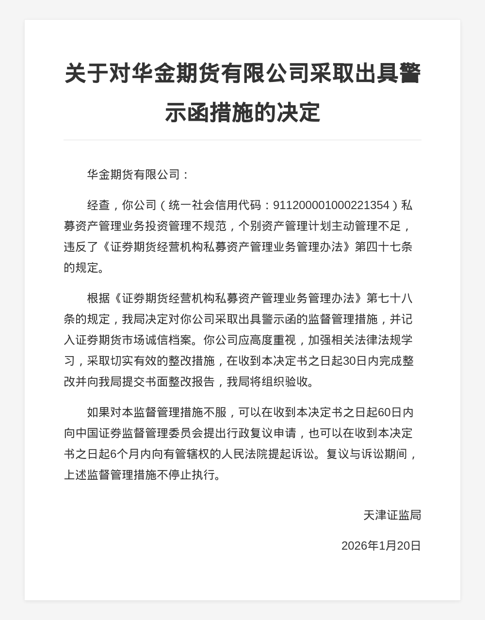 对此,天津证监局决定对华金期货有限公司采取出具警示函的监督管理措施,并记入证券期货市场诚信档案。