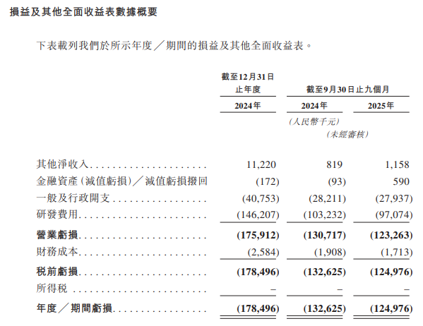 财务数据显示,2024年及2025年前三季度(以下简称“报告期”),普祺医药其他净收入分别为1122万元、115.8万元;营业亏损分别为1.76亿元、1.23亿元;年度/期间亏损分别为1.78亿元、1.25亿元。