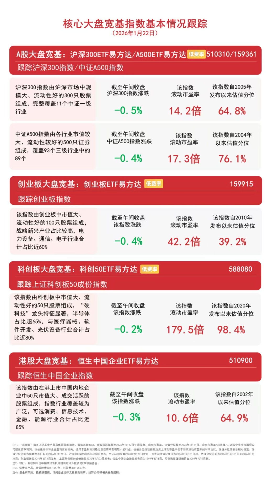 1月22日早盘,A股三大指数集体调整,全市场超3200只个股飘红。板块题材上,天然气、商业航天、军工装备、光伏设备、钢铁、煤炭、培育钻石、化学化工板块涨幅居前,贵金属、光刻机、半导体、保险、电池板块表现落后。港股震荡调整,科技股涨跌互现,消费股逆势上涨。截至午间收盘,中证A500指数下跌0.4%,沪深300指数下跌0.5%,创业板指数下跌0.4%,上证科创板50成份指数下跌0.2%,恒生中国企业指数下跌0.3%。