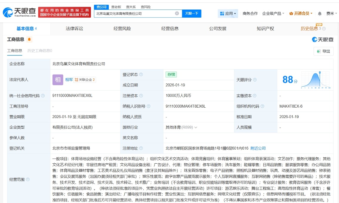 北京鸟巢文化体育公司登记成立
