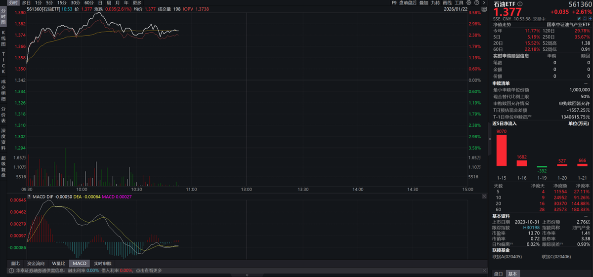 石油基本面受提振,石油ETF(561360)涨超2%,覆盖石油全产业链,资金持续布局,近20日资金净流入超3亿元。