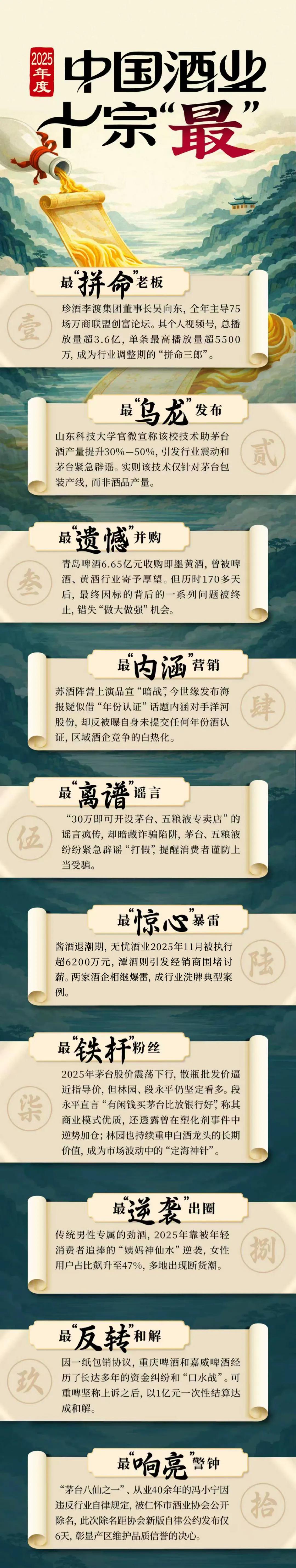 回顾不平凡的2025年,我们以十宗“最”截取这一年中国酒业别样的棱镜切片:从行业现象级“拼命三郎”老板,到坚定拥趸白酒的铁杆“粉丝”;从“乌龙”引发的行业震荡,到惊现行业“最离谱”骗局;从一桩“遗憾”止步的并购,到互掐多年的纠纷双方“逆转式”言和;从营销暗战中的区域竞合,到产品破圈背后的消费变迁;从向违规者敲响的产区警钟……