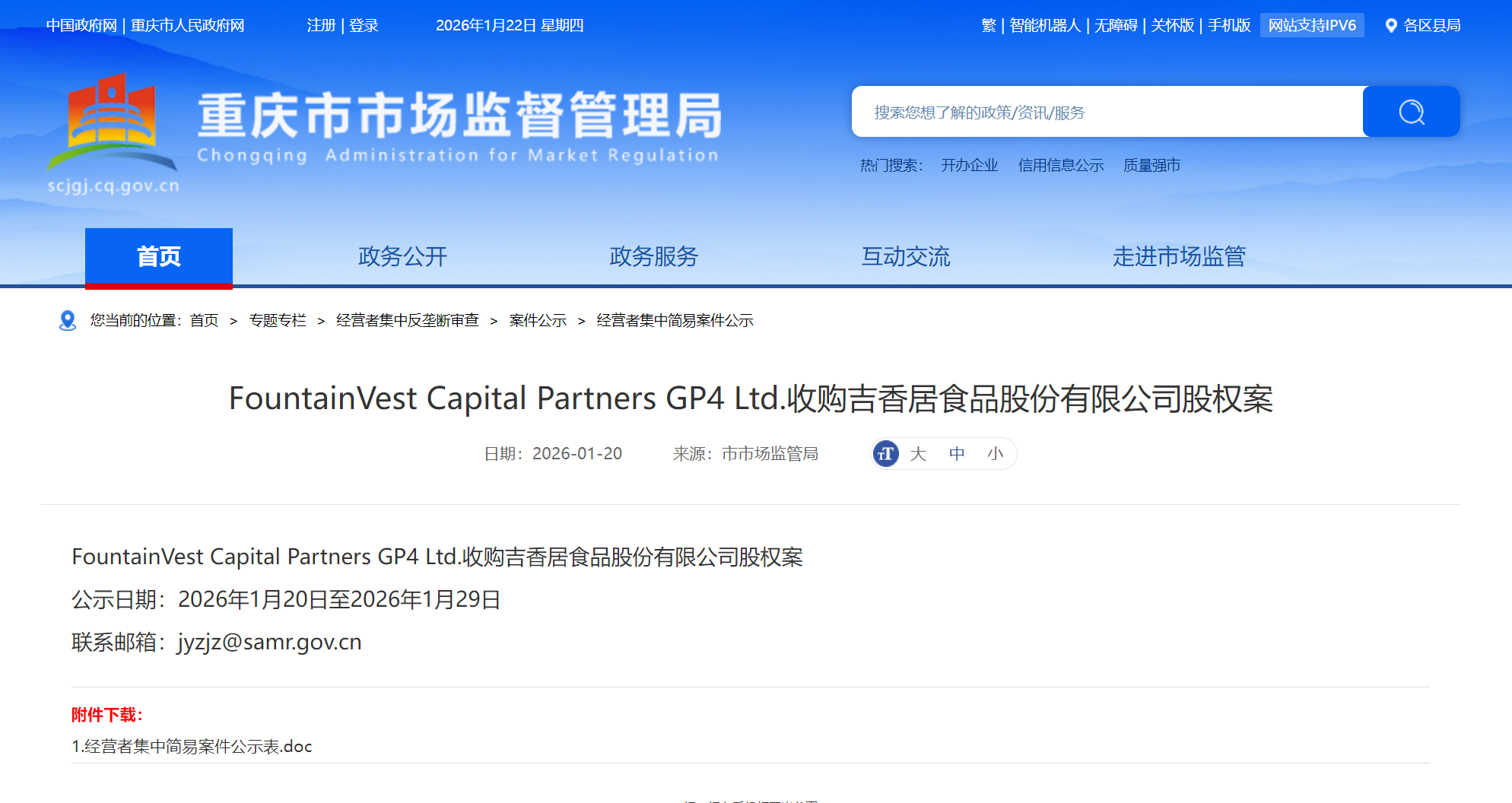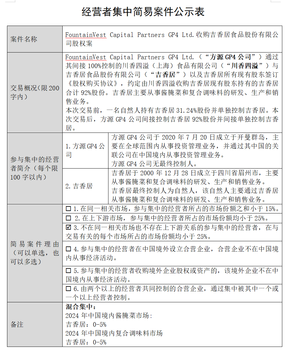 每经AI快讯,重庆市市场监管局官网1月20日公示的经营者集中简易案件显示,方源资本旗下主体FountainVestCapitalPartnersGP4Ltd.(方源GP4公司)对外披露经营者集中简易案件公示,宣布将通过其全资子公司“川香四溢”收购酱腌菜及复合调味料企业吉香居92%的股权。