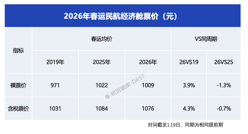 航班管家数据显示,由旺盛出行需求牵动,2月2日至3月13日机票预订价格逐步上涨,但尚未出现同比涨幅激增情况。截至1月19日,国内航班经济舱平均含税票价约为1076元,同比下降1.3%,较2019年同期上涨4.3%。
