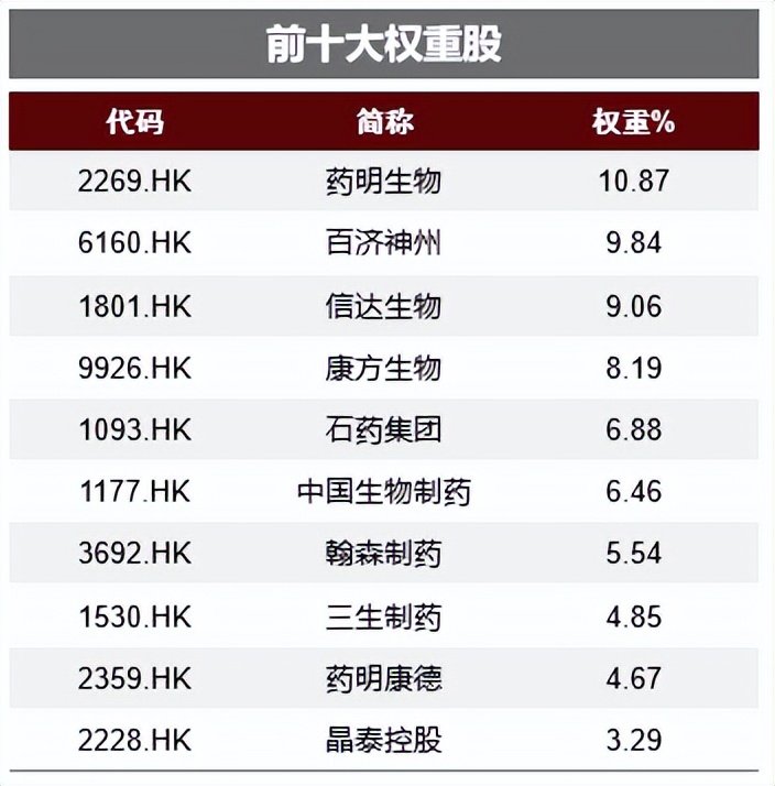 右侧列出了前十大成分股的简要信息,药明生物、百济神州、信达生物等创新药行业的龙头标杆企业,均被纳入该指数样本股。