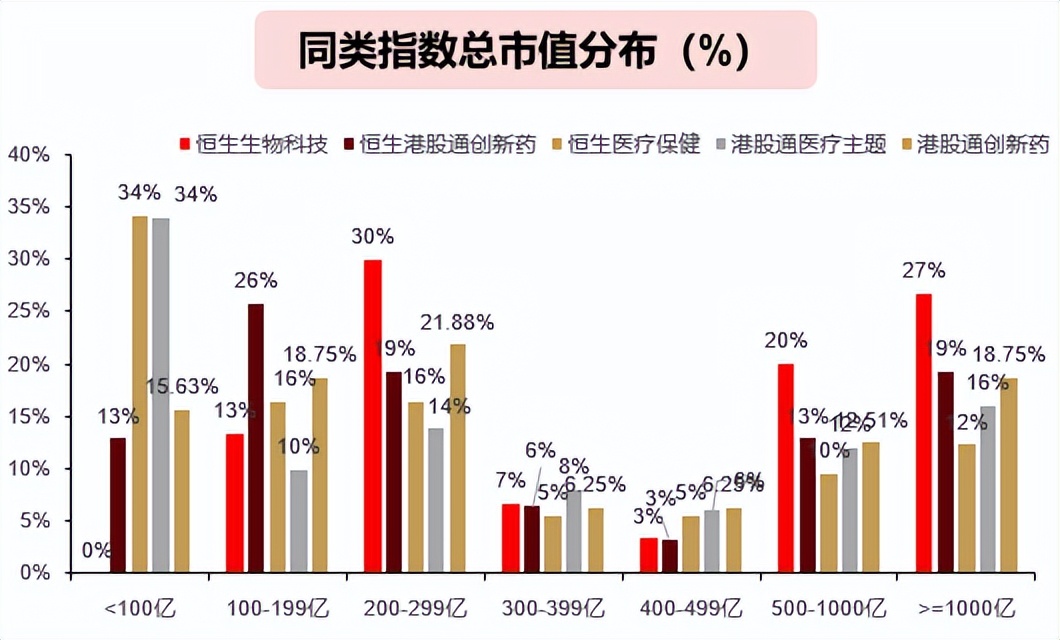 除此之外,该指数还有一个显著特征,大家可继续查看柱状图。中间区间,尤其是100亿至300亿市值区间,代表该指数的红色柱状图权重占比与其他指数形成了明显差异。这意味着,对于处于成长期的中盘生物科技公司,该指数的配置比例显著高于其他港股同类主题指数。