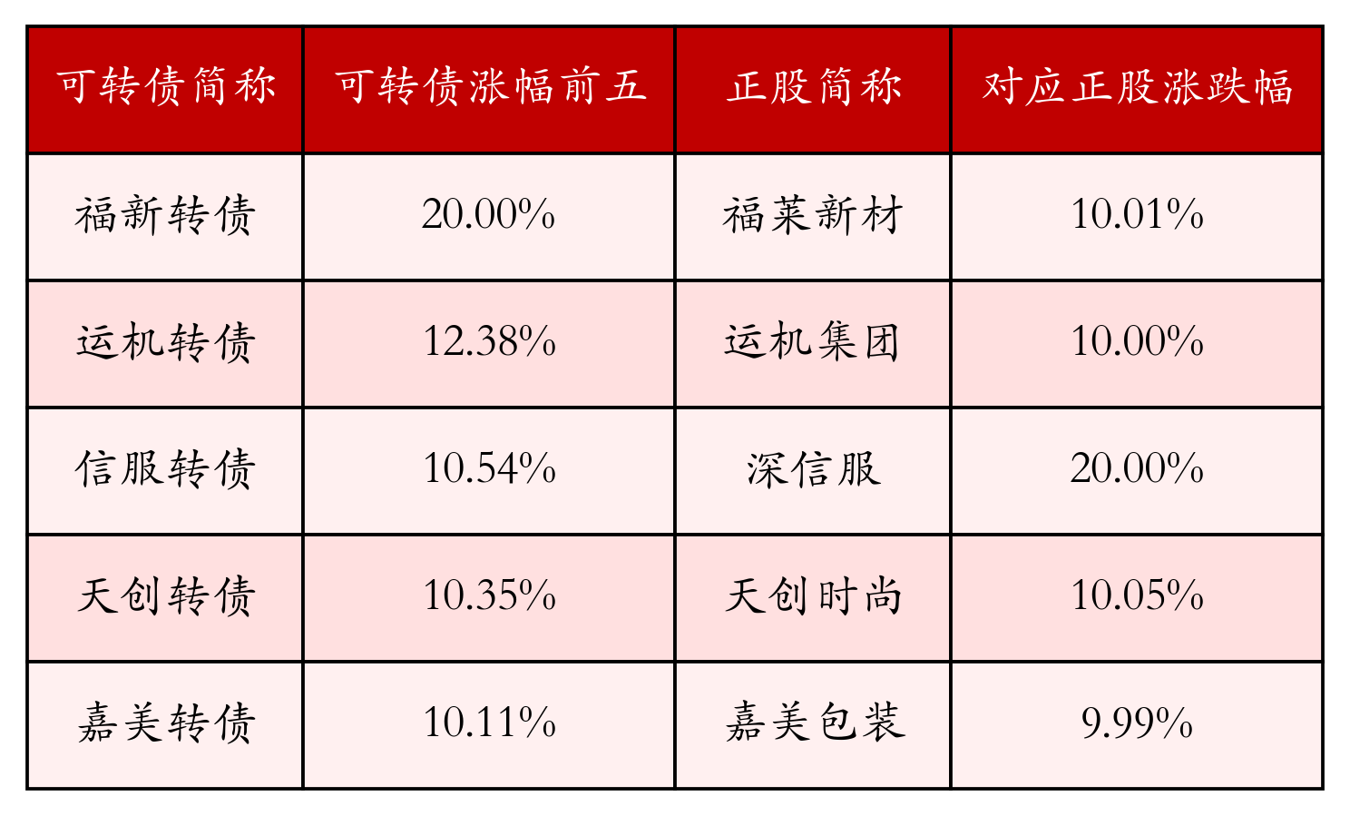 南财智讯1月22日电,盘后数据显示,债市方面,中证转债指数收涨0.91%,报527.73,成交额为887.47亿元。可转债方面,今日共成交377只可转债,其中312只收涨,1只收平,64只收跌。具体来看,55只可转债涨幅超过2%。其中福新转债(111012)涨20.0%,运机转债(127092)涨12.38%,信服转债(123210)涨10.54%。今日有12只可转债跌幅超2%,红墙转债(127094)跌4.95%,甬矽转债(118057)跌4.29%,东时转债(113575)跌3.87%。存在交易量的可转债所对应的正股中,246只收涨,2只收平,129只收跌。具体来看,22只可转债对应正股涨幅超过5%,其中,科顺股份(300737)涨停,收涨20.0%;深信服(300454)涨停,收涨20.0%;三角防务(300775)涨停,收涨19.99%。同时所对应的可转债:科顺转债(123216)同涨6.94%;信服转债(123210)同涨10.54%;三角转债(123114)同涨9.21%。今日有5只可转债对应正股跌幅超过5%,没有正股跌停。