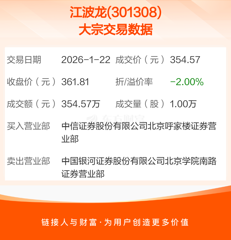 2026年1月22日,江波龙发生1笔大宗交易,共成交1.00万股,成交金额354.57万元。