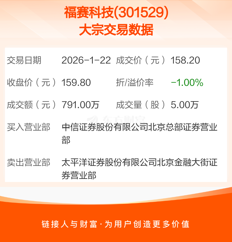 2026年1月22日,福赛科技发生1笔大宗交易,共成交5.00万股,成交金额791.00万元,占其流通市值比例为0.11%。