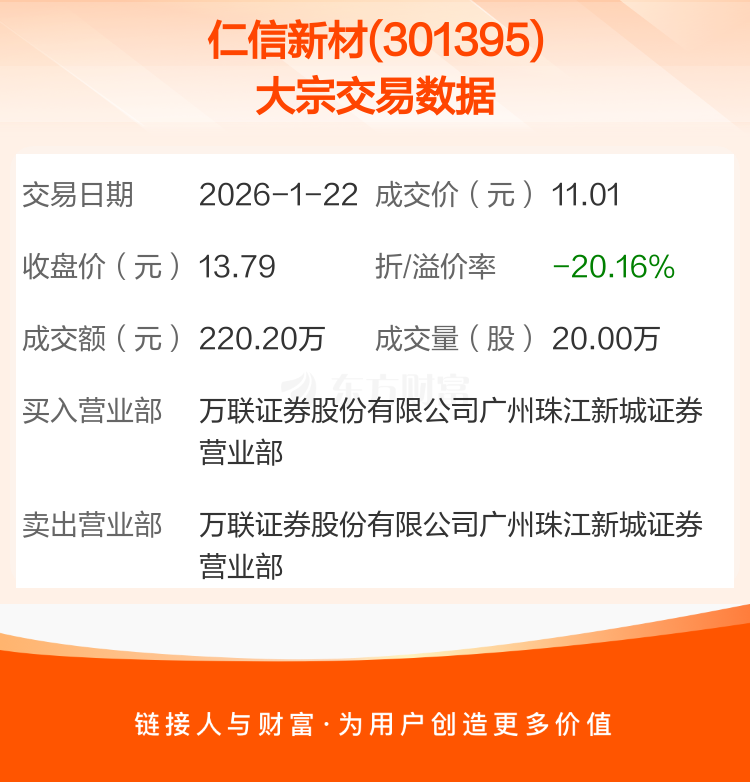 2026年1月22日,仁信新材发生1笔大宗交易,共成交20.00万股,成交金额220.20万元,占其流通市值比例为0.12%。