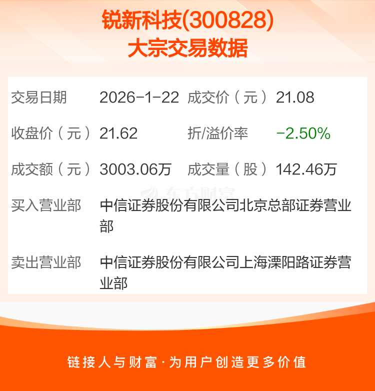 大宗交易:锐新科技成交3003.06万元,折价2.50%(1-22)