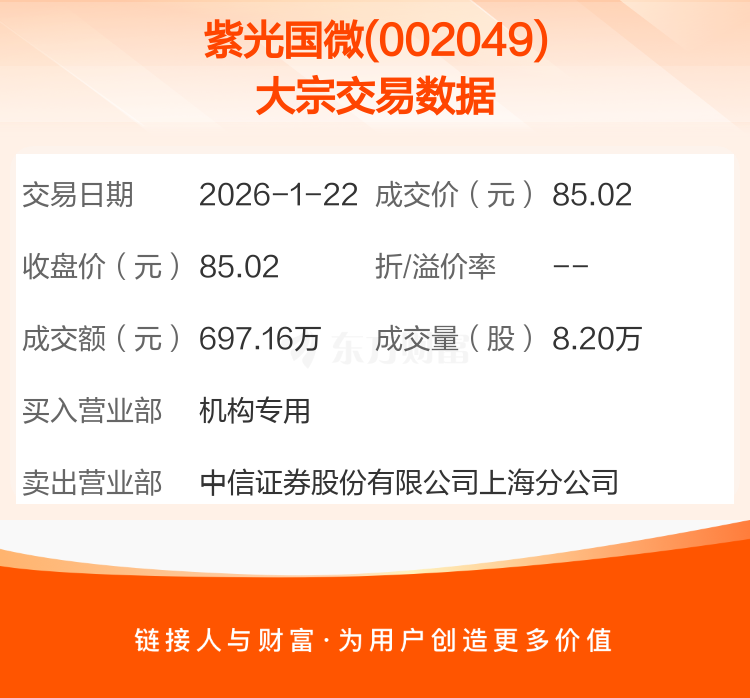 大宗交易:紫光国微成交697.16万元(1-22)