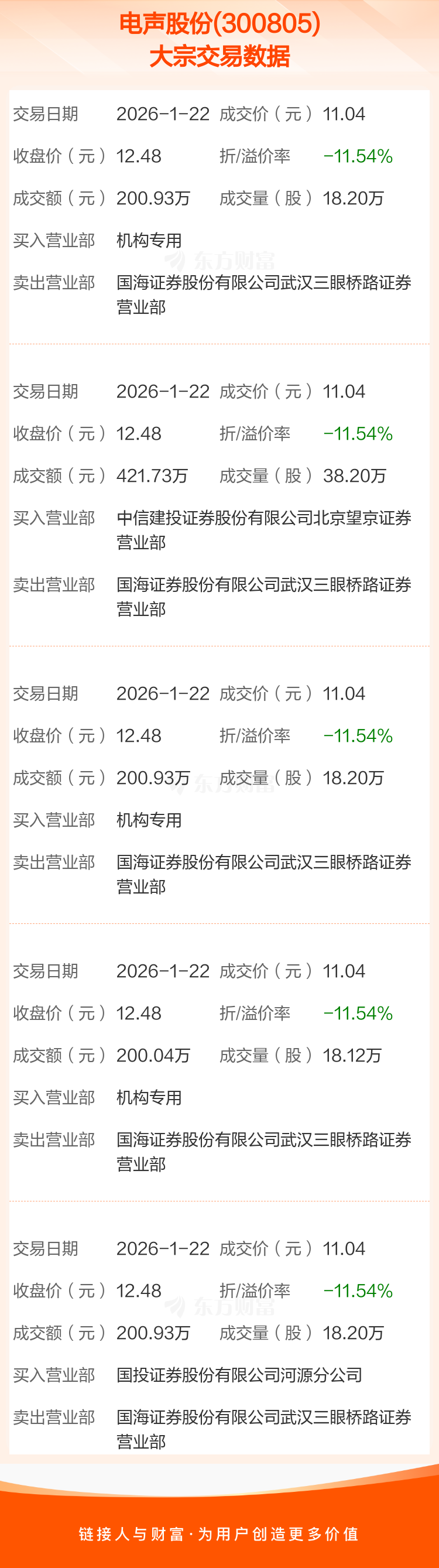 2026年1月22日,电声股份发生5笔大宗交易,共成交110.92万股,成交金额1224.56万元,占其流通市值比例为0.34%。