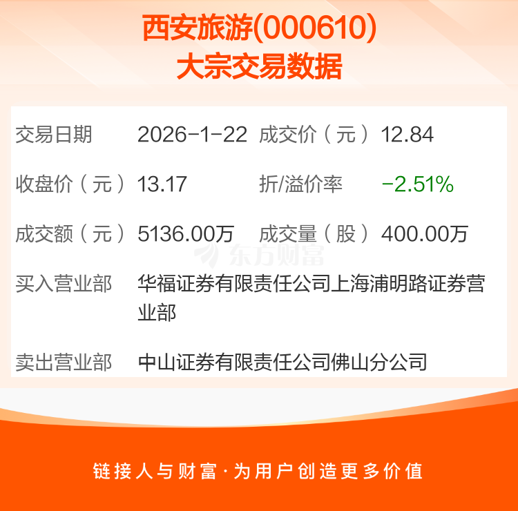 2026年1月22日,西安旅游发生1笔大宗交易,共成交400.00万股,成交金额5136.00万元,占其流通市值比例为1.66%。
