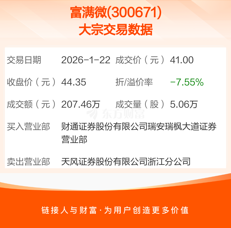 大宗交易:富满微成交207.46万元,折价7.55%(1-22)