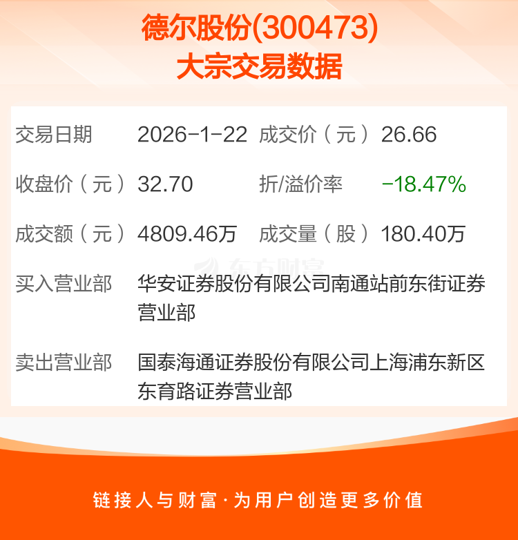 2026年1月22日,德尔股份发生1笔大宗交易,共成交180.40万股,成交金额4809.46万元,占其流通市值比例为0.98%。