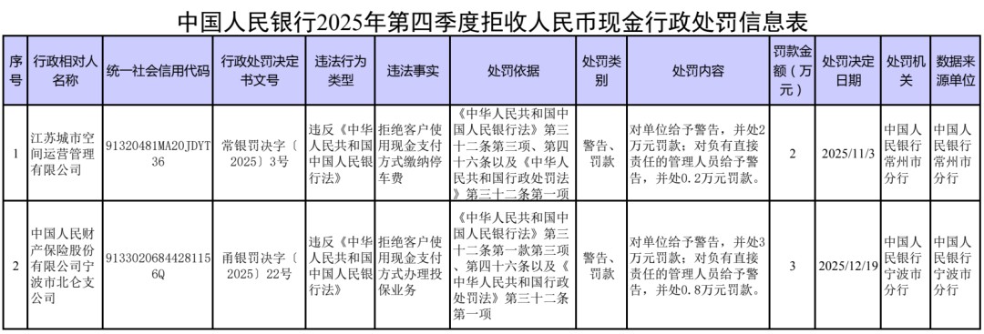 央行公布2025年第四季度拒收人民币现金行政处罚情况