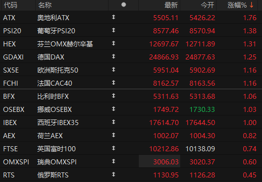 欧洲股市主要股指早盘普涨