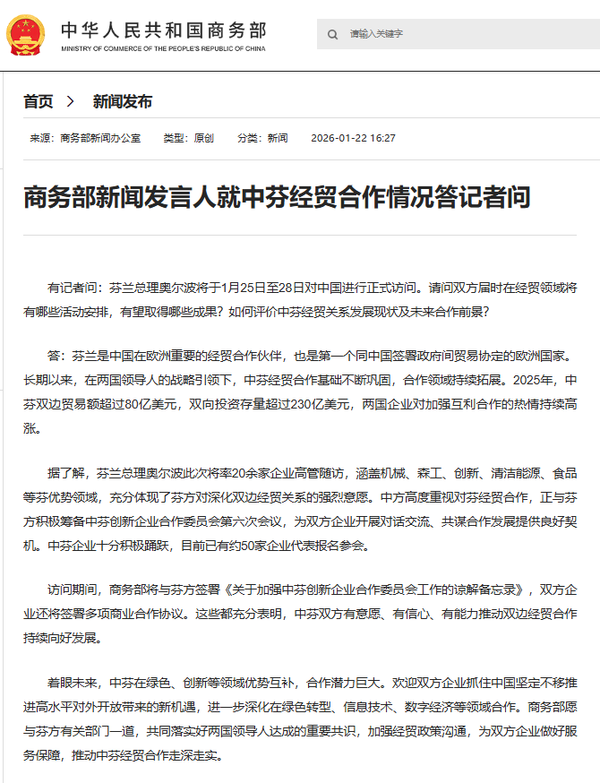 上证报中国证券网讯据商务部1月22日消息,商务部新闻发言人就中芬经贸合作情况答记者问。