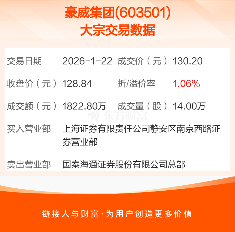 2026年1月22日,豪威集团发生1笔大宗交易,共成交14.00万股,成交金额1822.80万元,占其流通市值比例为0.01%。
