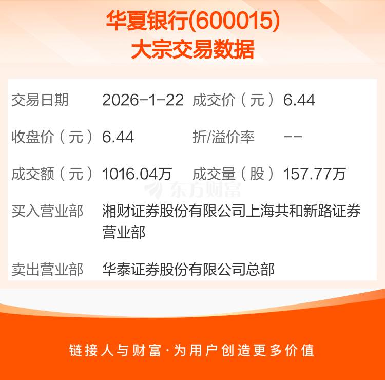 2026年1月22日,华夏银行发生1笔大宗交易,共成交157.77万股,成交金额1016.04万元,占其流通市值比例为0.01%。