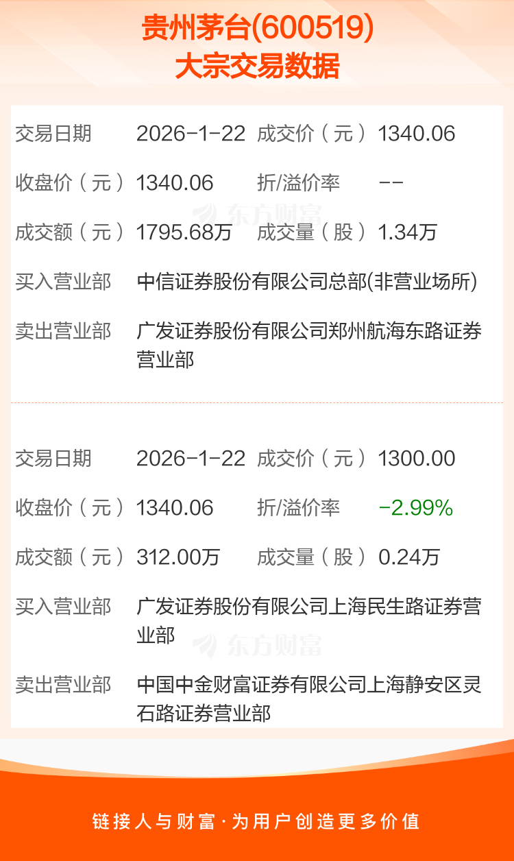 大宗交易:贵州茅台成交2107.68万元,折价0.45%(1-22)